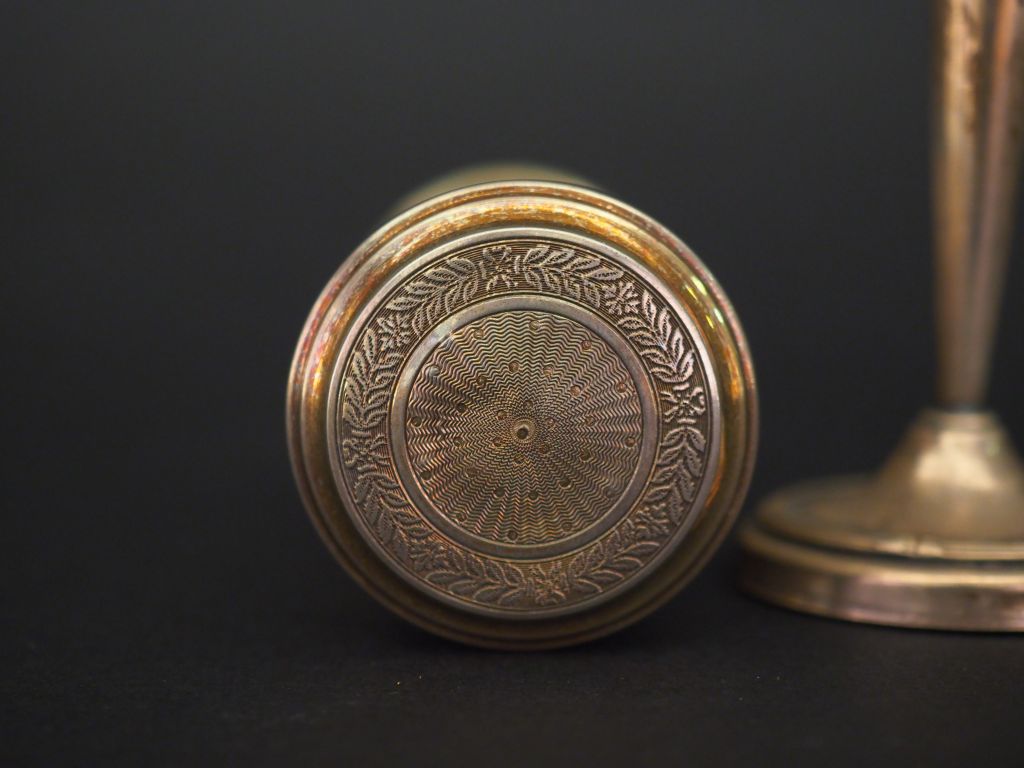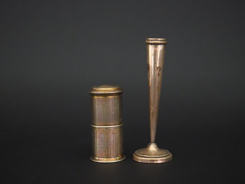 Ensemble comprenant : - une boite à cire de style Louis XVI en argent, poinçon Minerve, à décor de semi de pois et frise de feuillage. H.8 cm - un petit vase soliflore de style Louis XVI en argent, poinçon Minerve, à décor de tiges enrubannées. H. 13 cm Poids. 74 g