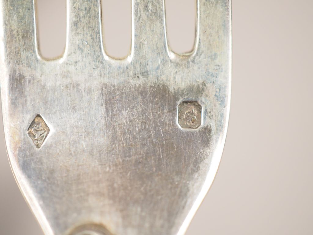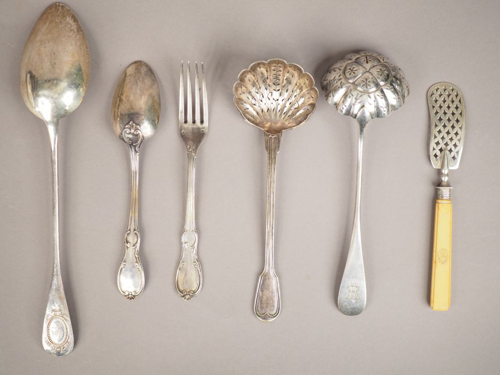 Ensemble comprenant : - une cuillère à ragoût en argent, poinçon Minerve. - un couvert de style Louis XV en argent, poinçon Minerve, modèle feuillagé. - deux cuillères à saupoudrer, l'une en argent, poinçon Minerve, l'autre en métal argenté Christofle. - une pièce de service à hors d'œuvres en argent et ivoire, poinçon Minerve. Poids tel. 342 g