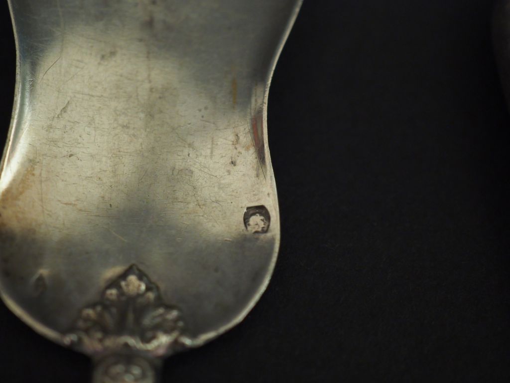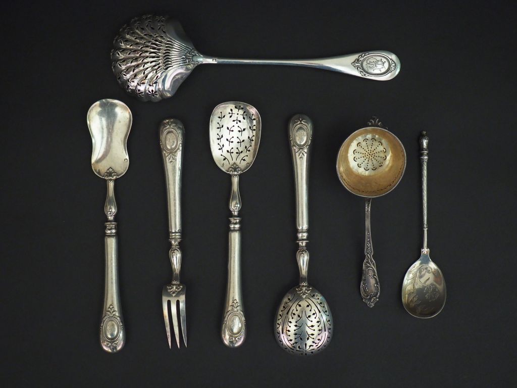 Ensemble comprenant : - une cuillère à saupoudrer de style Louis XVI en argent, poinçon Minerve, à décor de cartouche monogrammé. M.O : H Fils Long. 21 cm Poids. 71 g - une passette à thé de style Louis XV en argent, poinçon Minerve, à décor de feuillage et rinceaux. Long. 14 cm Poids. 16 g - une cuillère à glace en argent, à décor de branchage et monogramme. Long. 13 cm Poids. 16 g - un nécessaire à douceurs en argent et argent fourré, poinçon Minerve, à décor de cartouche monogrammé. Poids tel. 111 g