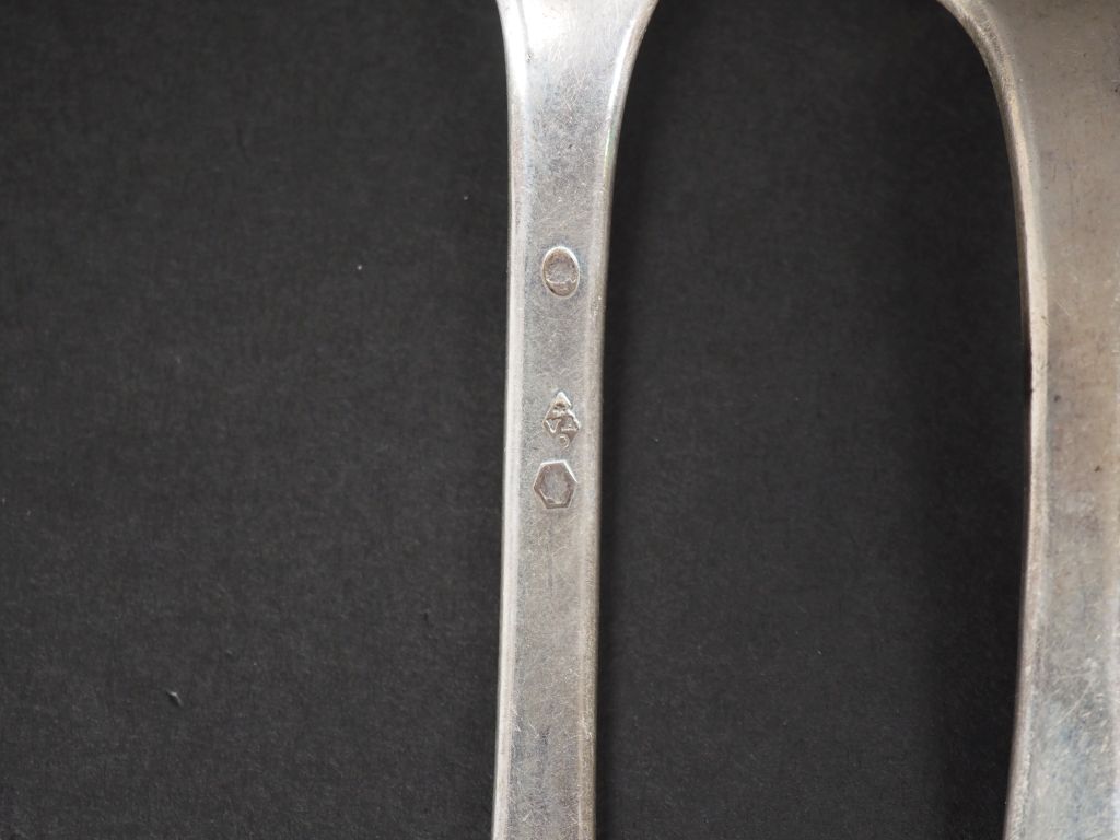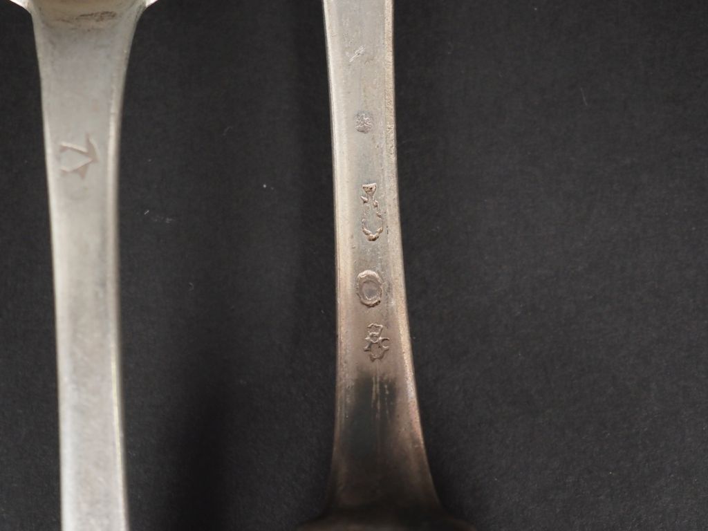Ensemble comprenant : - une cuillère XVIIIème en argent. Monogrammée. Long. 21 cm - trois fourchettes en argent, poinçons dépareillés (une poinçonnée au 1er Coq, une autre Restauration, poinçon Vieillard) Long. 20 cm et 21,3 cm - deux cuillères dépareillés en argent, l'une Restauration poinçon Vieillard. Long. 20 cm et 20,5 cm Poids. 476 g