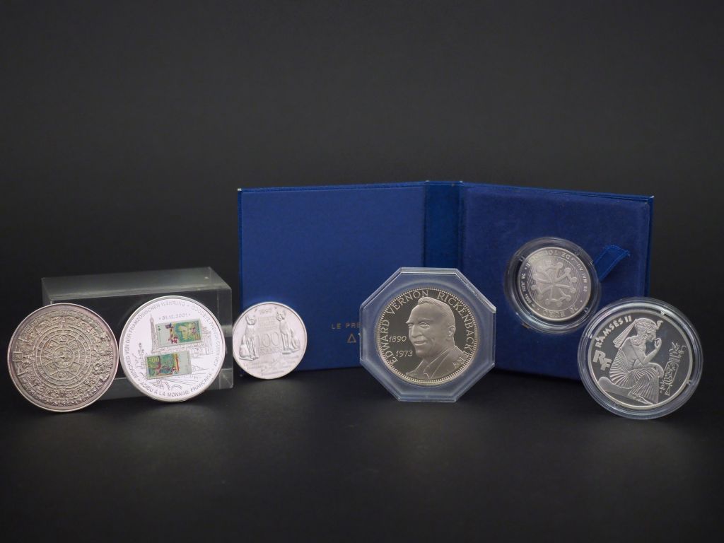 Ensemble comprenant : - une médaille méxicaine en argent. Poids. 30 g - une médaille en argent figurant André Malraux. Poids. 15 g - une médaille en argent, figurant Edward Vernon Rickenbacker. Poids. 27 g - une pièce de 10 Francs en argent, figurant Ramsès II. Poids. 22 g - une médaille commémorative en argent, marquée "Adieu à la monnaie française". Poids tel. 33 g - une pièce de 20 euros en argent, figurant la Basilique Saint Sernin de Toulouse. Poids. 13 g