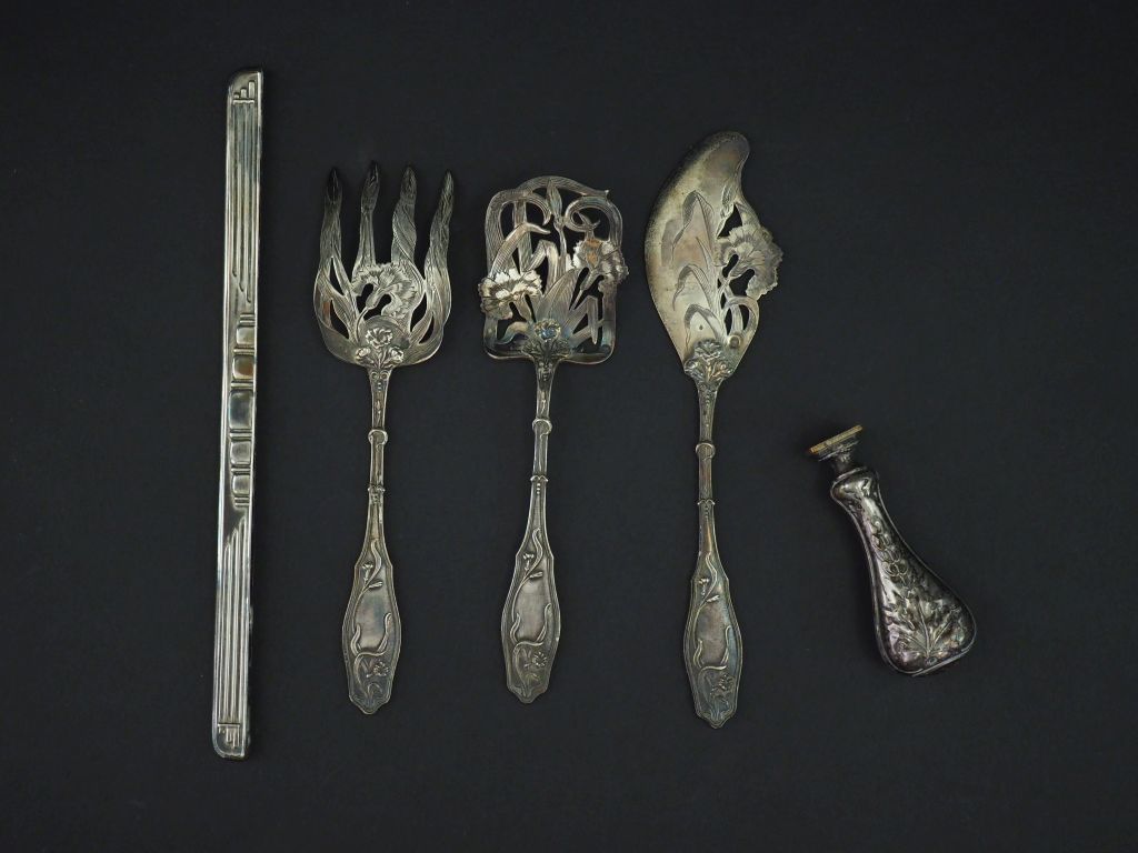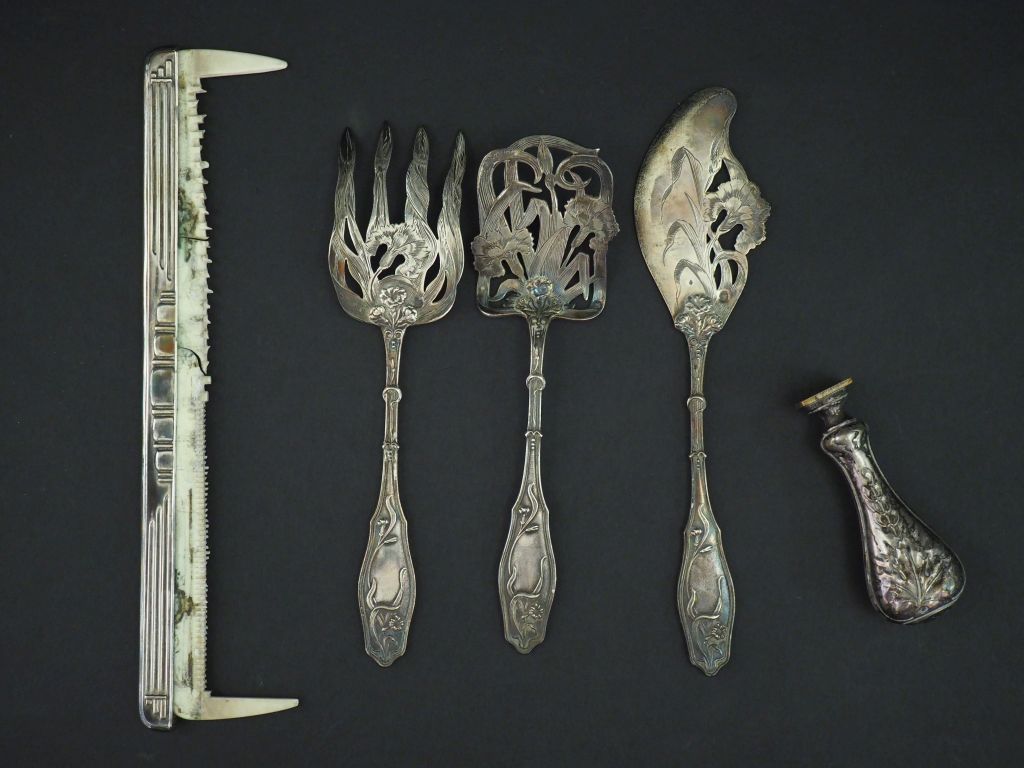 Ensemble comprenant : - une partie de nécessaire à douceur de style Art Nouveau en argent 925, poinçon Minerve, à décor d'œillets. - une monture de peigne de style Art déco en argent 925, poinçon Minerve, à décor de motifs géométriques. Poids. 77 g On y joint un cachet en métal ou argent, à décor de feuillage.