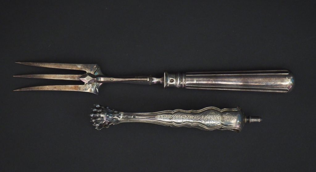 Ensemble comprenant : - une pince à sucre en argent, poinçon Minerve, à décor de rinceaux feuillagés et fleuris. - une fourchette à gigot en argent et argent fourré, poinçon Minerve. Poids tel. 229 g