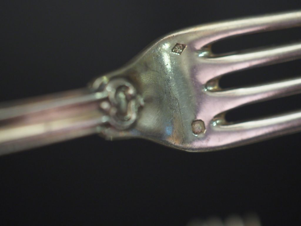 Ensemble comprenant : - une suite de six couverts à entremets de style Louis XV en argent, poinçon Minerve, modèle à cartouche feuillagé. Monogrammés. H Cie. On y joint un couvert à entremets du même modèle en argent, poinçon Minerve. Monogramme dépareillé. - une suite de six couverts à entremets en argent, poinçon Minerve, à décor de branchage fleuri. Monogrammés. Poids. 1338 g