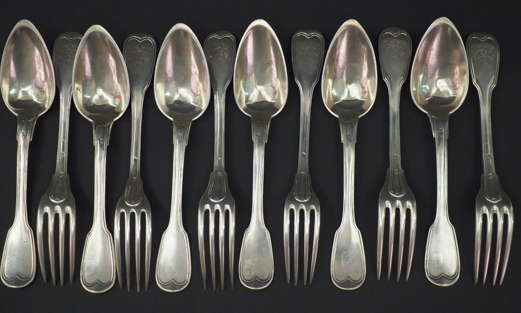 Ensemble comprenant : - une suite de six grandes cuillères Restauration en argent, poinçon Vieillard, modèle à filet. Armoriées. - une suite de six grandes fourchettes en argent, poinçons dépareillés, modèle à filet. Armoriées. Poids. 1089 g