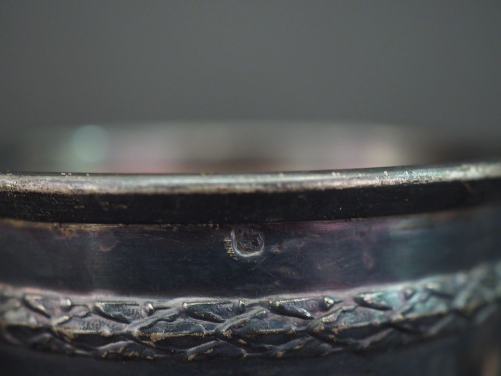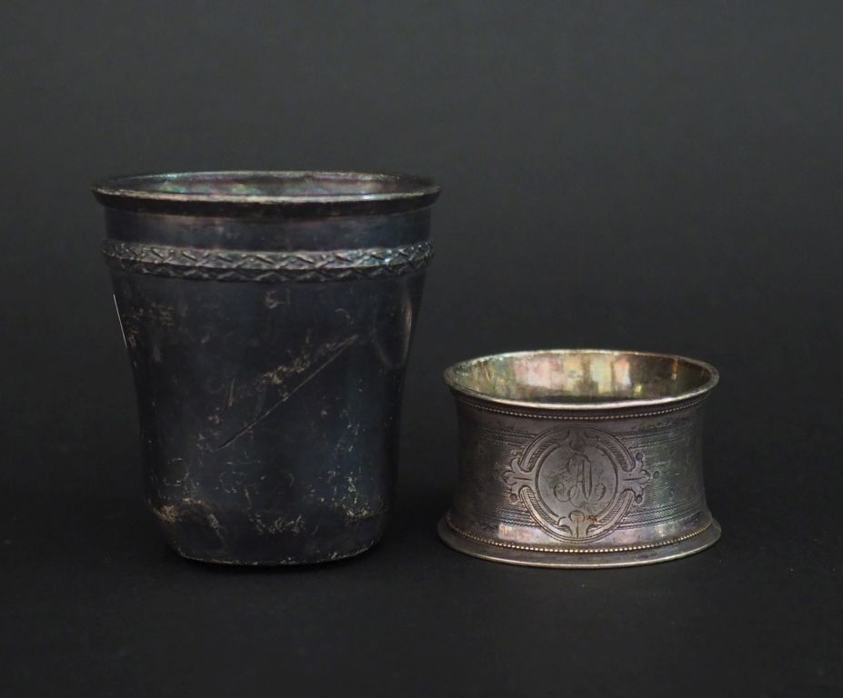 Ensemble comprenant : - une timbale de style Louis XVI en argent 925, poinçon Minerve, à décor de guirlande de feuilles de laurier. Gravée "Jacqueline". H. 7 cm (enfoncements) - un rond de serviette en argent 925, poinçon Minerve, à décor de monogramme dansun cartouche sur fond de semi de pois. H. 3,3 cm Poids. 65 g