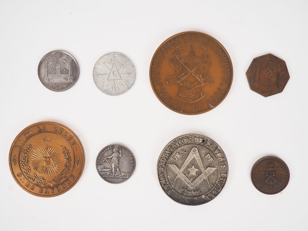 Ensemble de 8 jetons ou médailles maçonniques comprenant : - Orient de Bordeaux, loge "anglaise" de Bordeaux. - Le Havres, loges des "3H" en argent. Poids. 9.5 g. - Loge "les amis de la liberté" - Orient de Tarbes, centenaire du temple 1889-1989. - Orient de Metz, loge "Pierre Perrat à l'étoile flamboyante" 1979. - Orient de Bayonne, loge "la zélée". - Orient de Paris, loge "Saint Louis de France" 1816. - Jeton de présence, loge "fédération maçonnique".