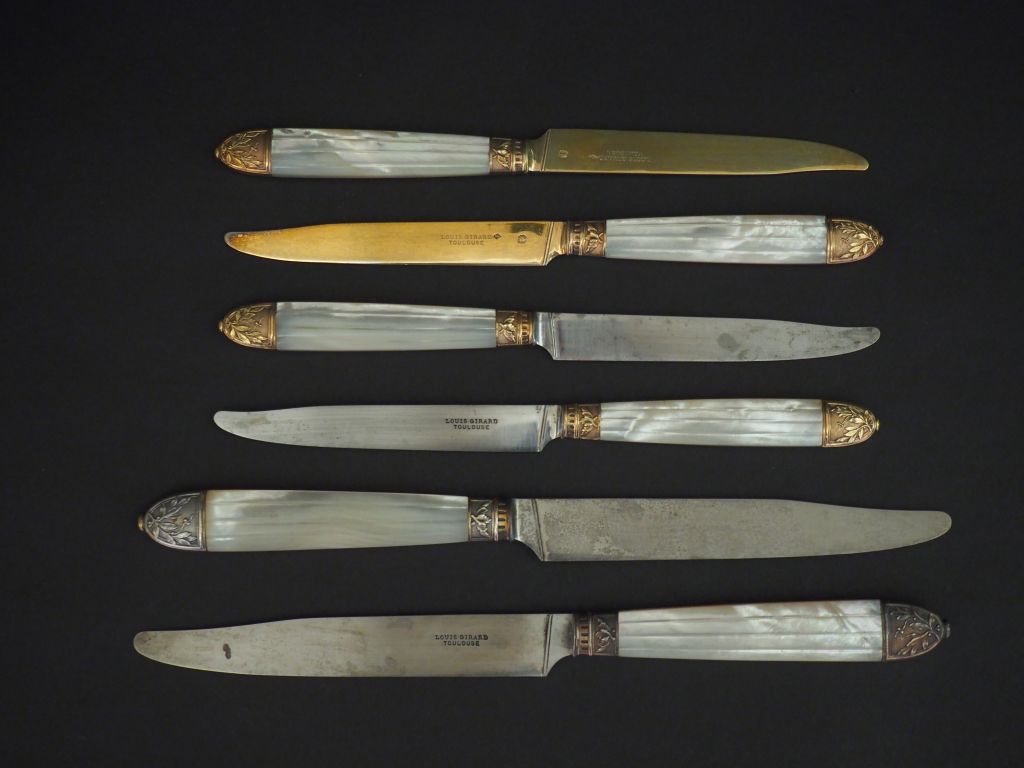 Ensemble de couteaux assortis, manche en nacre cannelée. Comprenant : - douze couteaux à fruit lame en vermeil, poinçon Minerve. - douze grands couteaux, lame en métal (sauts de vermeil) - douze couteaux à fromage, lame en métal M.O : Louis Girard à Toulouse