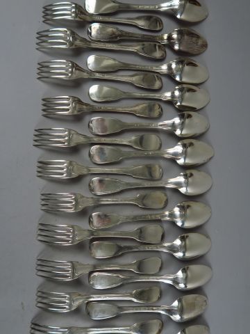 Ensemble de couverts uniplats en argent, poinçons du XVIIIe dépareillés. Poids : 3 375 g