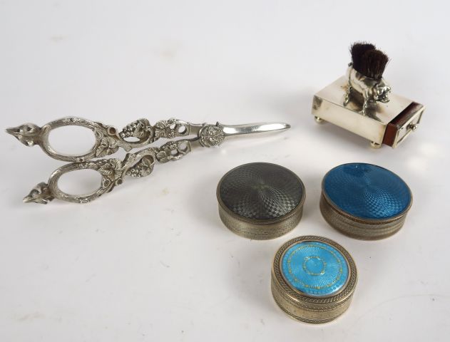 Etui à plumes en argent et bois, surmonté d'un cochon, trois boites à pilules en argent et émail. Poids tel : 174 g. On y joint une paire de ciseaux à raisin en métal argenté
