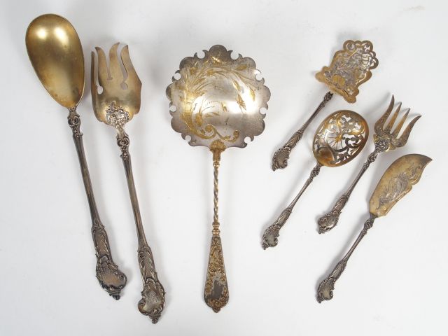 FOLLIOT. Couvert à salade et nécessaire à douceur quatre pièces de style rocaille en argent et vermeil, poinçon Minerve. On y joint une cuillère à glace de style rocaille en argent et vermeil. Poids : 380 g