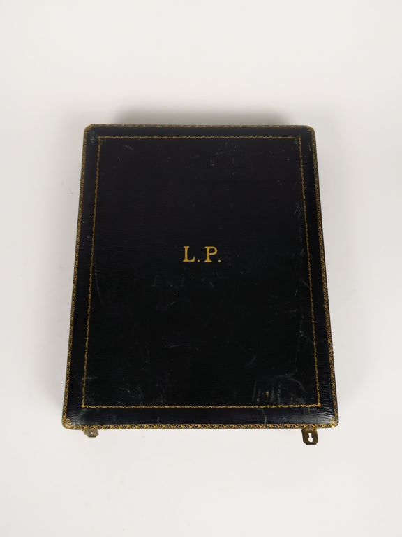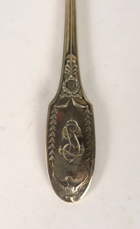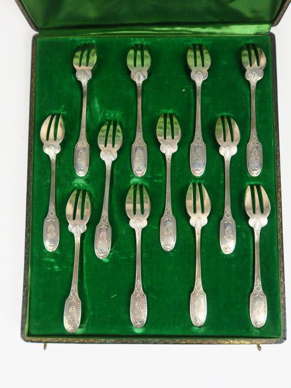 FOUQUET-LAPAR. Suite de 12 fourchettes à gateaux de style Empire en argent, poinçon Minerve. Monogrammées. Dans leur écrin d'origine. Poids : 372 g