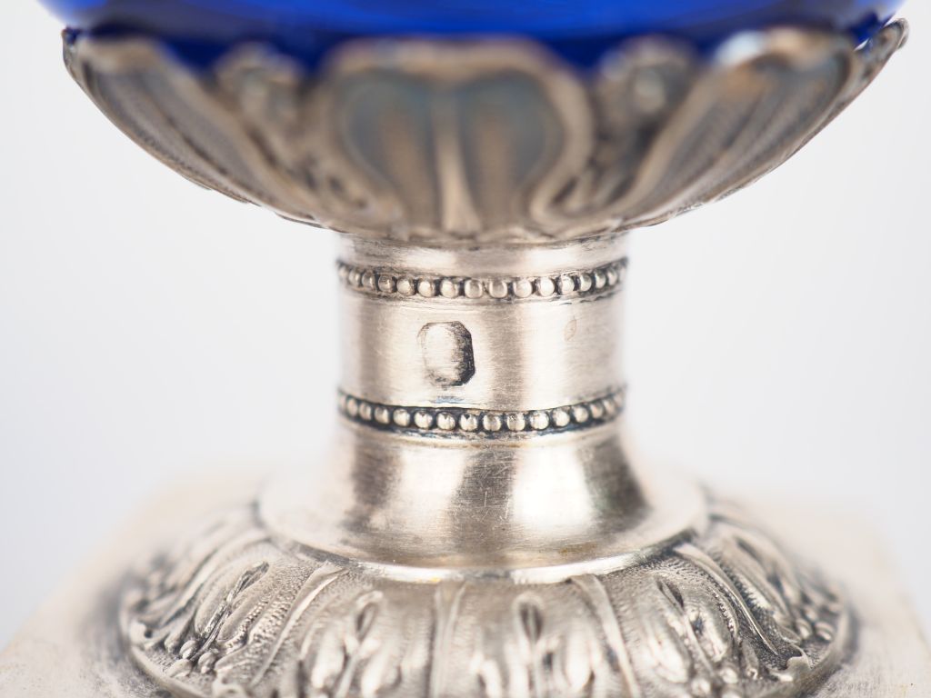 Garniture de table Restauration en argent, poinçon Vieillard, à décor de frises de feuilles d'acanthe, fleurs et feuillage. Reposant sur quatre pieds griffes tenant une boule. Comprenant : - un moutardier et sa verrine. (accident, petites égrenures à la verrine) - une paire de salerons et leurs verrines. Poids. (sans les verrines) : 185 g