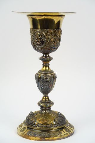 Grand calice et sa patène en vermeil Restauration poinçon Minerve, décor gravé et en repoussé d'anges, de scènes de la vie du Christ dans des réserves, de pampres et d'épis de blé. 1013 g. H : 31,5 cm