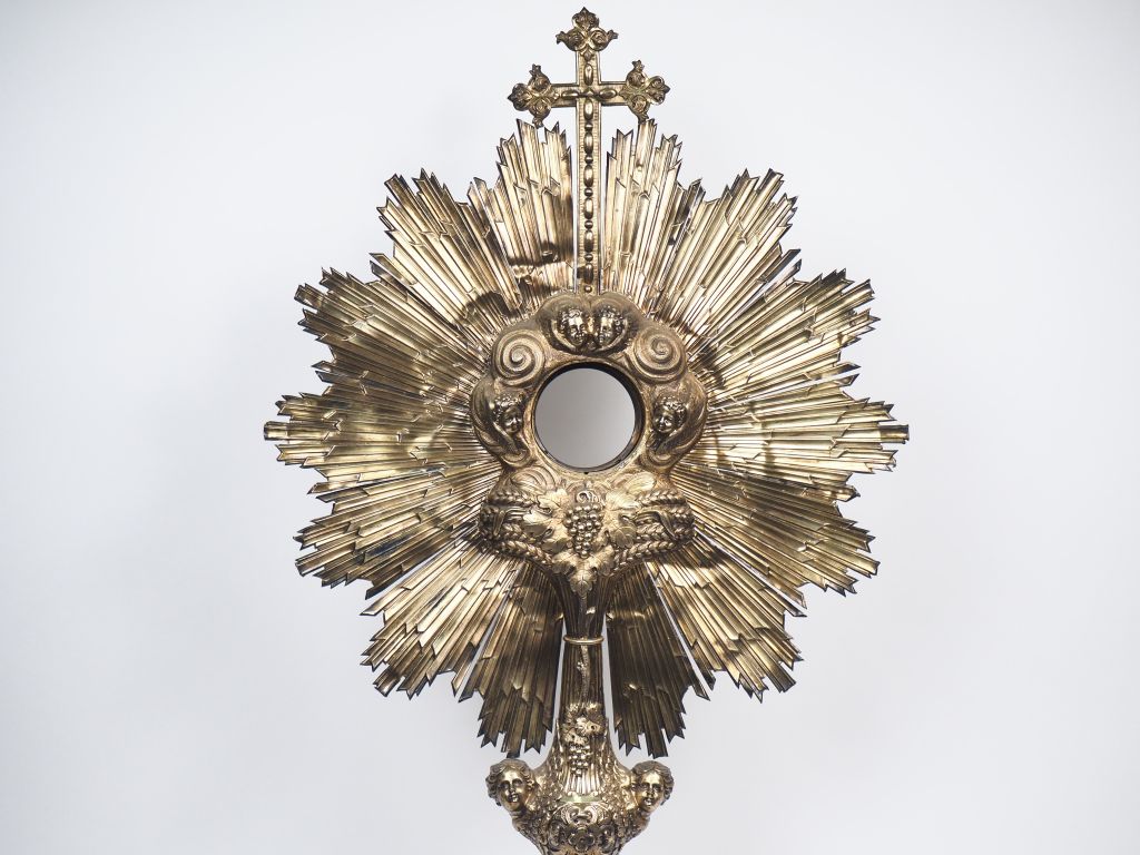 Grand ostensoir en vermeil 925, poinçon Minerve, motif central rayonnant agrémenté d'une croix, de têtes d'angelots, d'épis de blé et de pampres. Reposant sur quatre pieds feuillagés, la base à décor de rinceaux et de l'Agneau Pascal. H. 80 cm Poids. 1370 g (petits accidents)