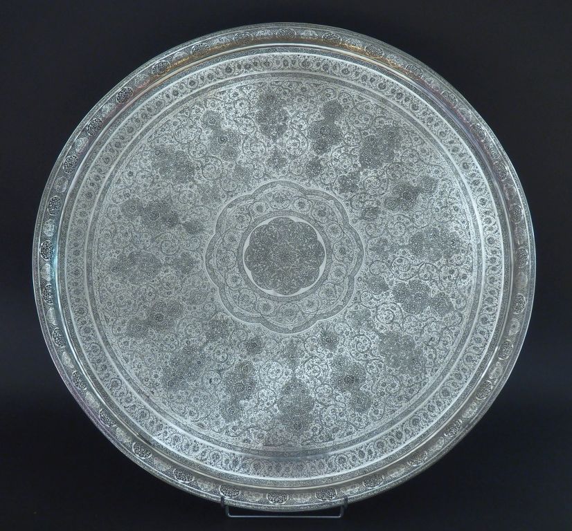 Grand plateau oriental en argent étranger, à décor finement gravé de fleurs, rinceaux feuillagés et agrémenté d'inscriptions. Diam. 71,5 cm Poids. 5700 g