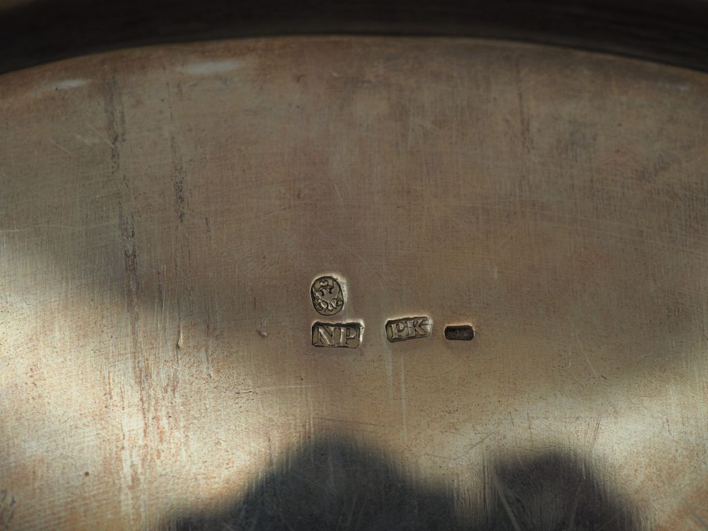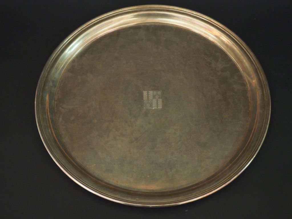 Grand plateau rond en argent russe, à décor en son centre d'armoiries. Diam. 39 cm Poids. 1520 g