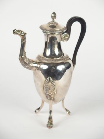 Grande cafetière tripode de style Empire en argent, poinçon Vieillard, à décor de palmette et de frises de feuilles d'eau. Piètement griffe. Poids : 520 g
