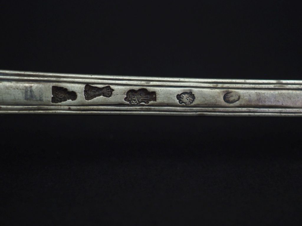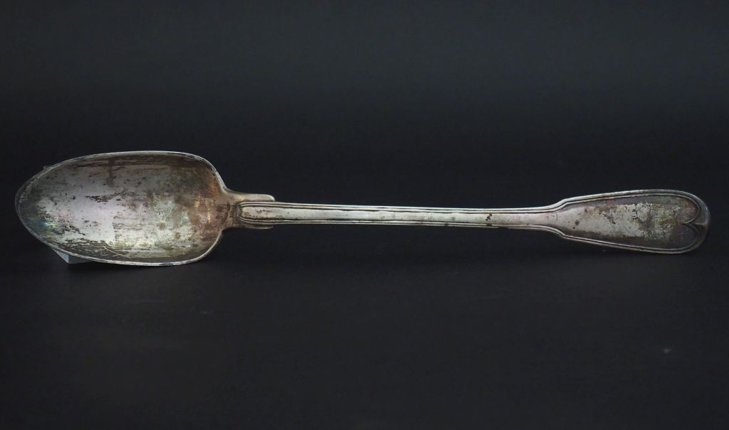 Grande cuillère à ragoût XVIIIème en argent, modèle à filet. Armoriée. Long. 32,5 cm Poids. 177 g