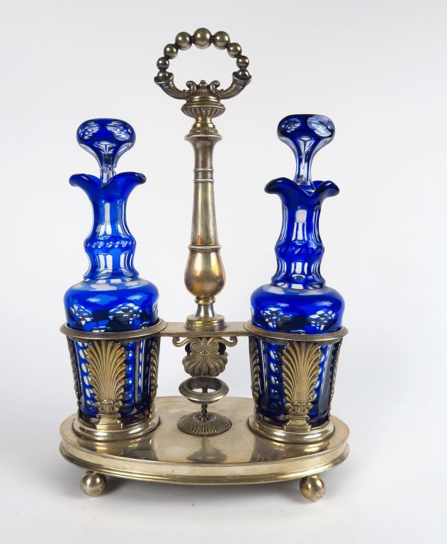 Huilier en argent, poinçon Vieillard, à décor de palmettes et de godrons. Maitre orfèvre AC. Poids : 620 g. On y joint deux flacons en cristal bicolore (un bouchon recollé)