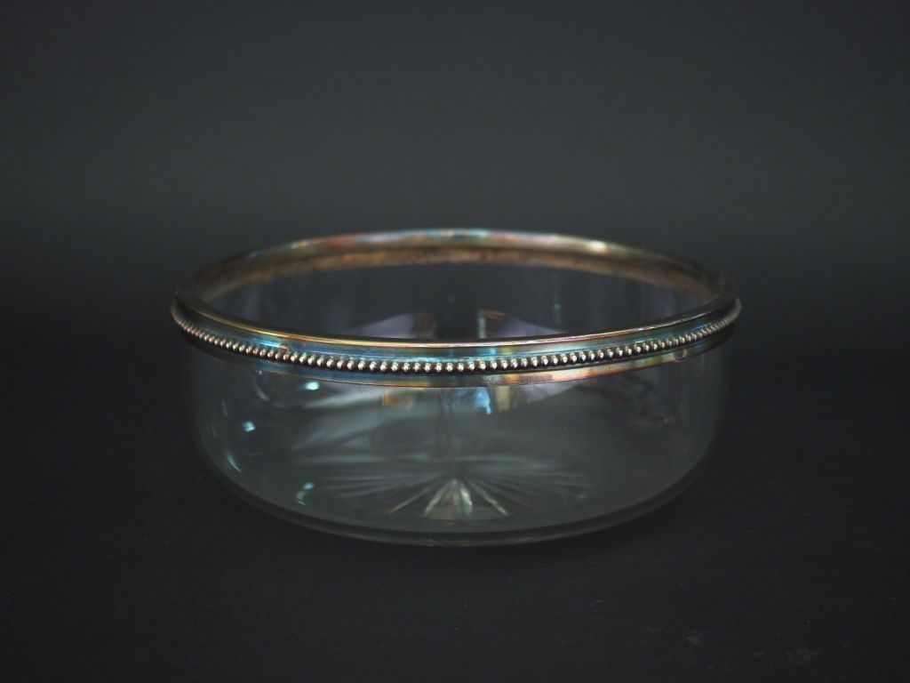 Jatte à crème de style Louis XVI en cristal et argent, poinçon Minerve, à décor de rang de perles. H. 7,5 cm Diam. 20,5cm Poids tel. 765 g