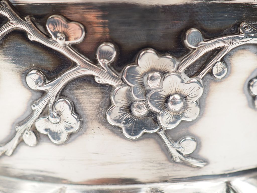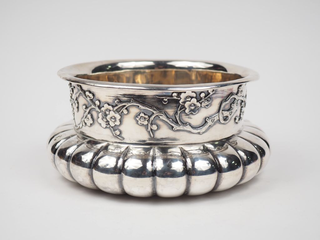 Jatte creuse en argent étranger, à décor de godrons et de branchages de cerisier fleuris. Poids. 765 g