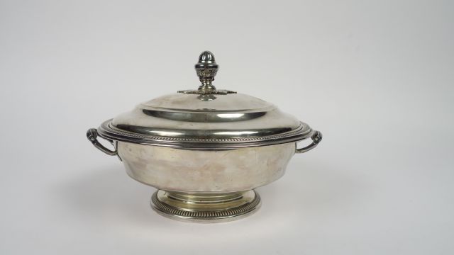 Légumier de style Louis XVI en argent, poinçon Minerve, à décor de godrons, prise en forme de gland. Poids : 810 g (prise légèrement accidentée)