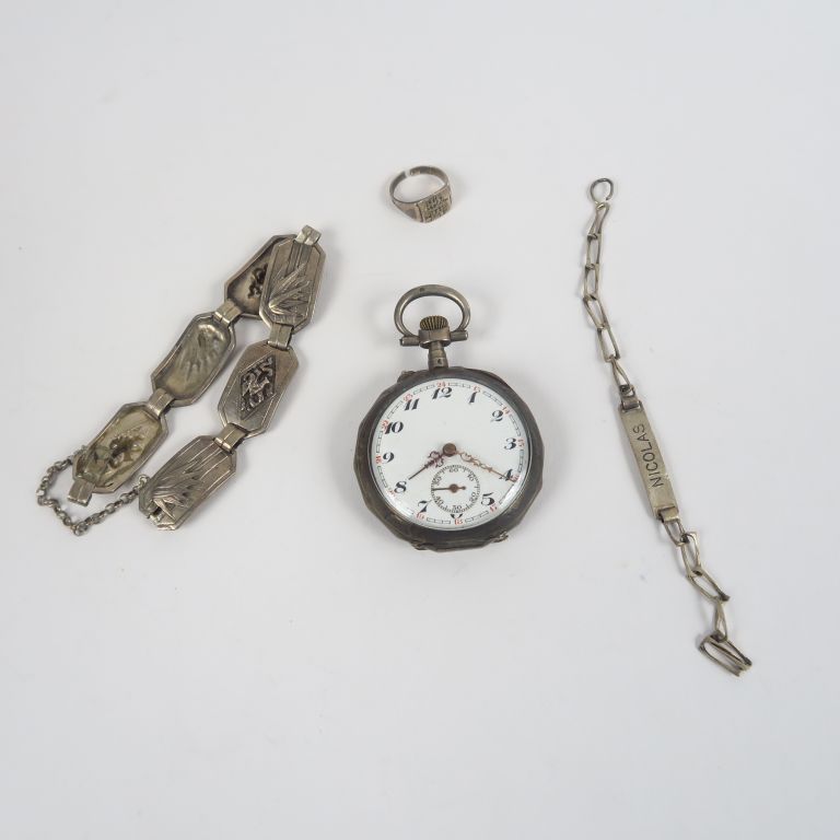 Lot comprenant : - deux différents bracelets en argent. Poids. 24,91 g - montre de gousset en argent. Poids tel. 60 g - une bague en argent Poids. 2,14 g (accidentée)