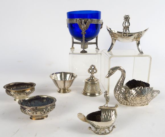 Lot comprenant un vide poche en argent étranger, un saleron en forme de berceau en argent étranger, un saleron en en argent en forme de cygne, une coupelle en argent, une paire de salerons 1900 en argent, une cloche de table en argent et un sucrier de style Empire, monture en argent, poinçon Minerve, à décor de cygnes. Poids (sans la verrine) : 477 g