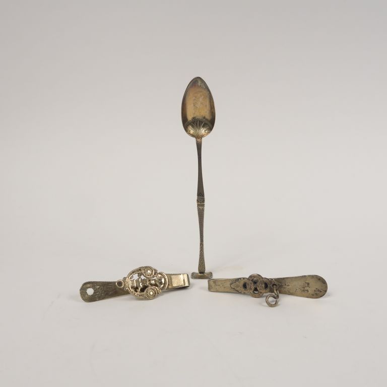 Lot comprenant : - une cuillère en argent, poinçon Minerve. - deux différents éléments de chatelaine en argent, poinçon Minerve. Poids. 94 g