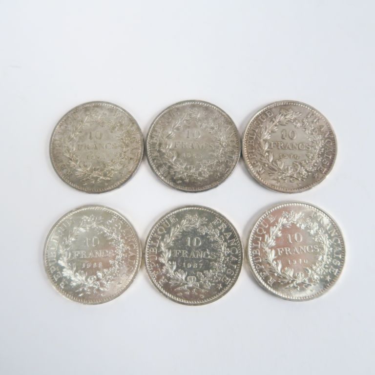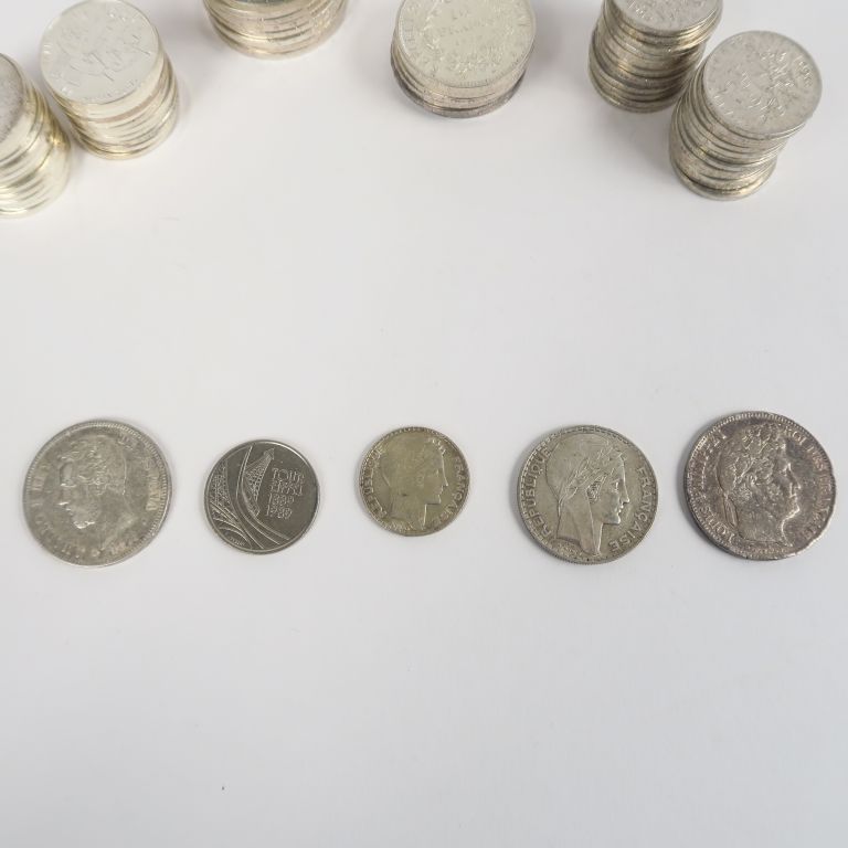 Lot de pièces en argent : - 25 pièces de 5 Francs en argent. 299 g - 13 pièces de 50 Francs en argent. 390 g - 24 pièces de 100 Francs en argent. 361 g - 6 pièces de 10 Francs en argent. 150 g - 1 pièce de 5 Francs argent 1854 - 1 pièce de 5 , 1871 - 1 pièce de 20 Francs argent 1934 - 1 pièce de 10 Francs argent 1931 - 1 pièce de 5 Francs 1889