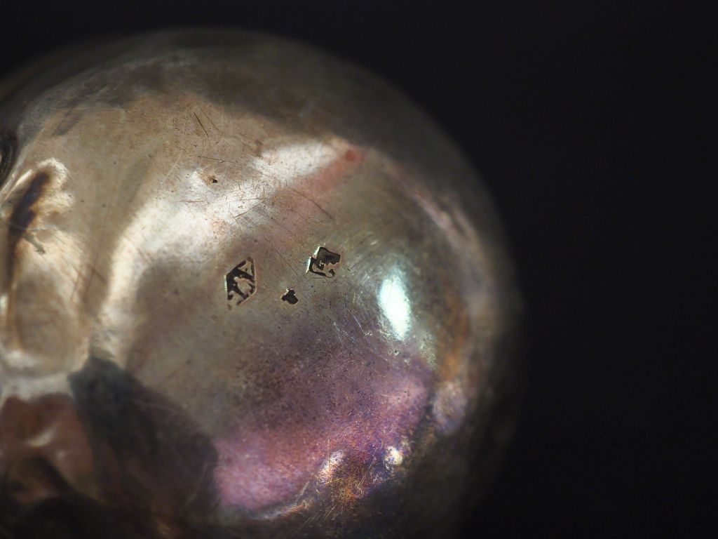 Louche à punch en argent, poinçon au Coq, manche en corne. Long. 31,5 cm Poids tel. 46 g (petits enfoncements)
