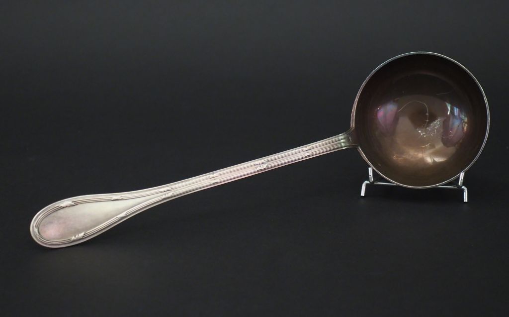 Louche de style Louis XVI en argent, poinçon Minerve, à décor de tiges enrubannées. Long. 29 cm Poids. 195 g