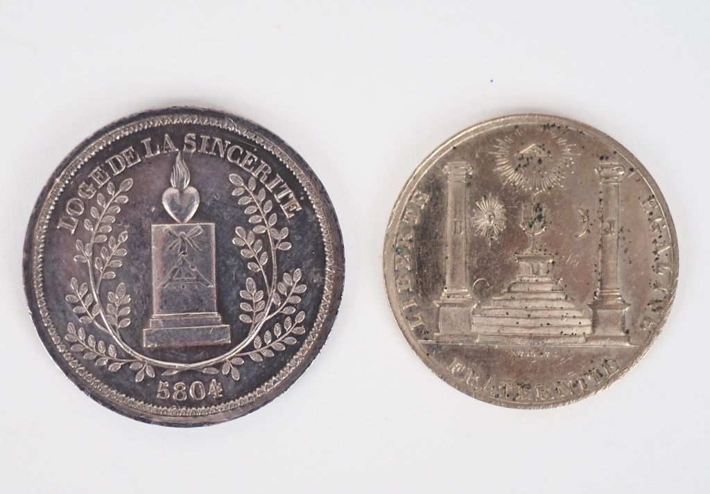Médaille maçonnique en argent, Orient de Reims loge "la sincérité". Poids. 7,7 g. On y joint 1 médaille maçonnique, Orient du Havre loge de "l'olivier écossais".