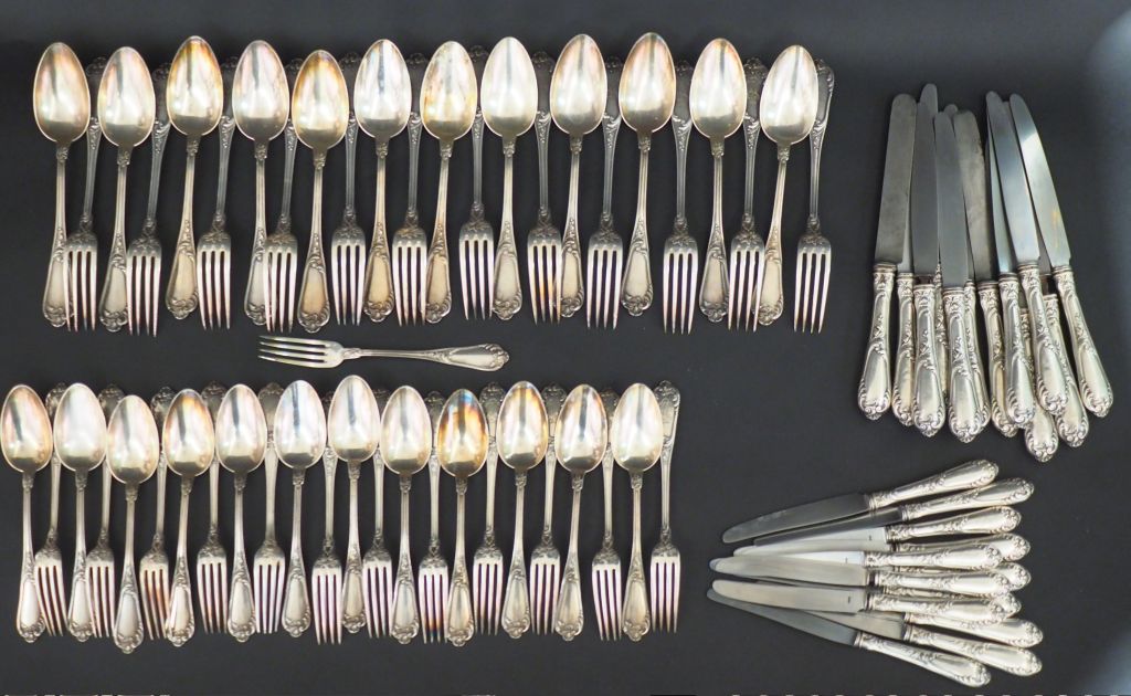 Ménagère Napoléon III en argent, poinçon Minerve, modèle feuillagé et monogrammé comprenant : 12 grands couverts, 12 couverts à entremets et une fourchette, 12 couteaux à fromage, 12 grands couteaux Poids (sans les couteaux) : 3300 g
