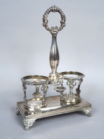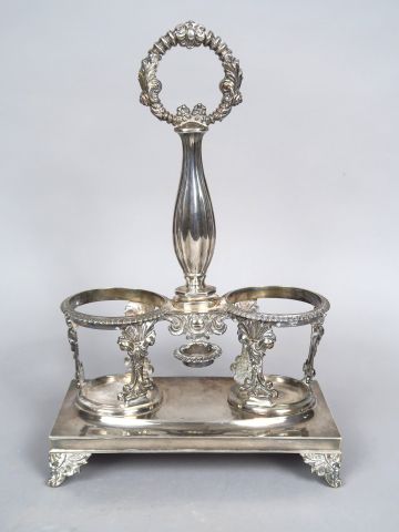 Monture d'huilier en argent, poinçon Minerve, à décor de rinceaux, de coquilles et de fleurs. Poids : 544 g
