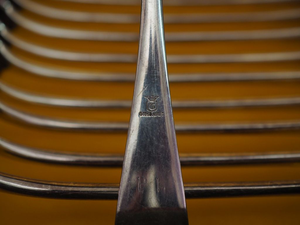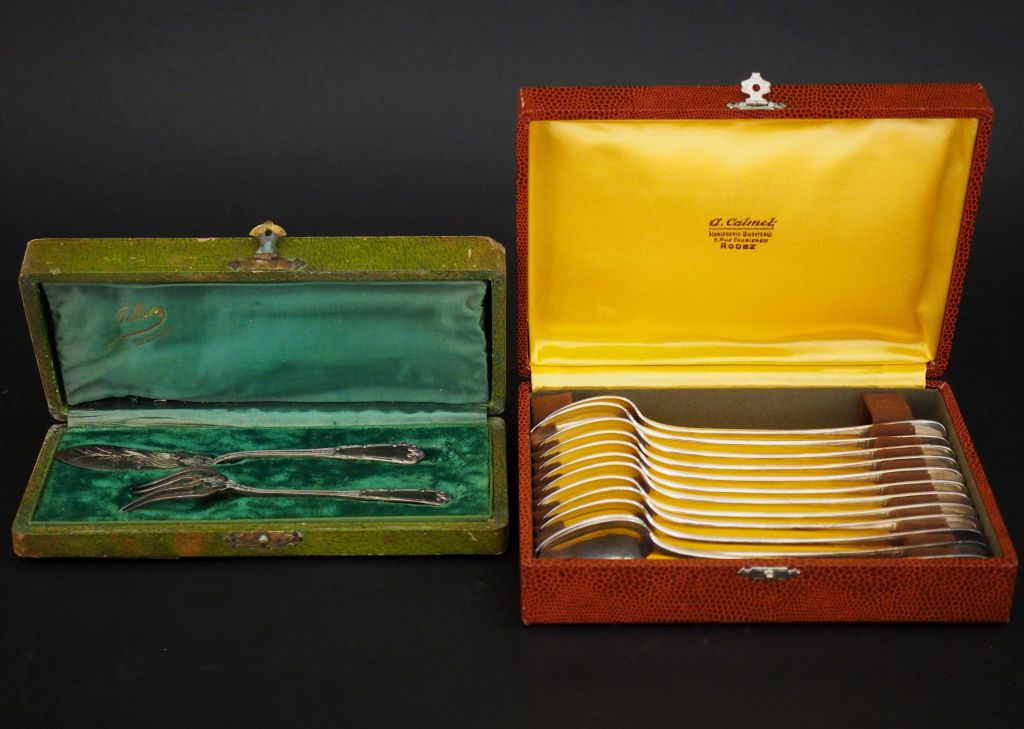 Nécessaire à douceurs deux pièces de style rocaille en argent 925, poinçon Minerve, à décor de feuillage, rinceaux et coquilles. Poids. 59 g Dans son écrin. On y joint une suite de douze cuillères à cocktail en métal argenté. M.O : Gombault Dans leur écrin.