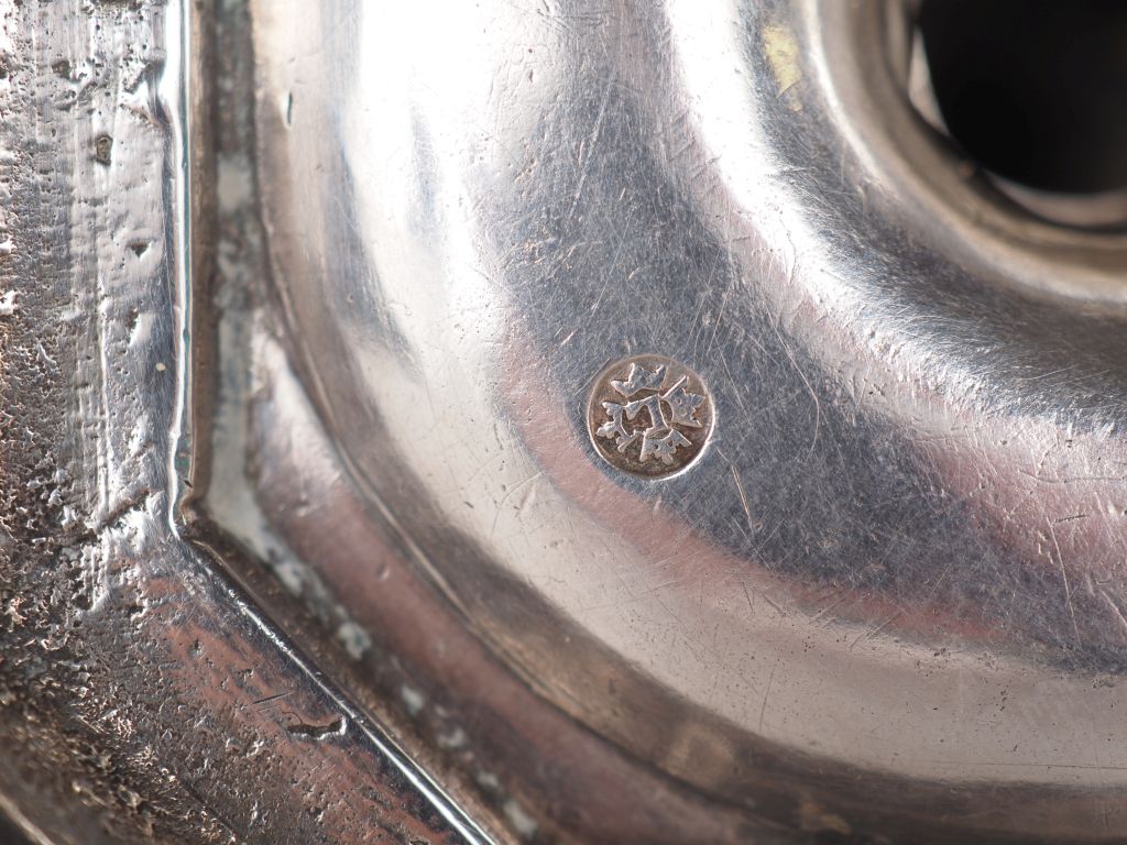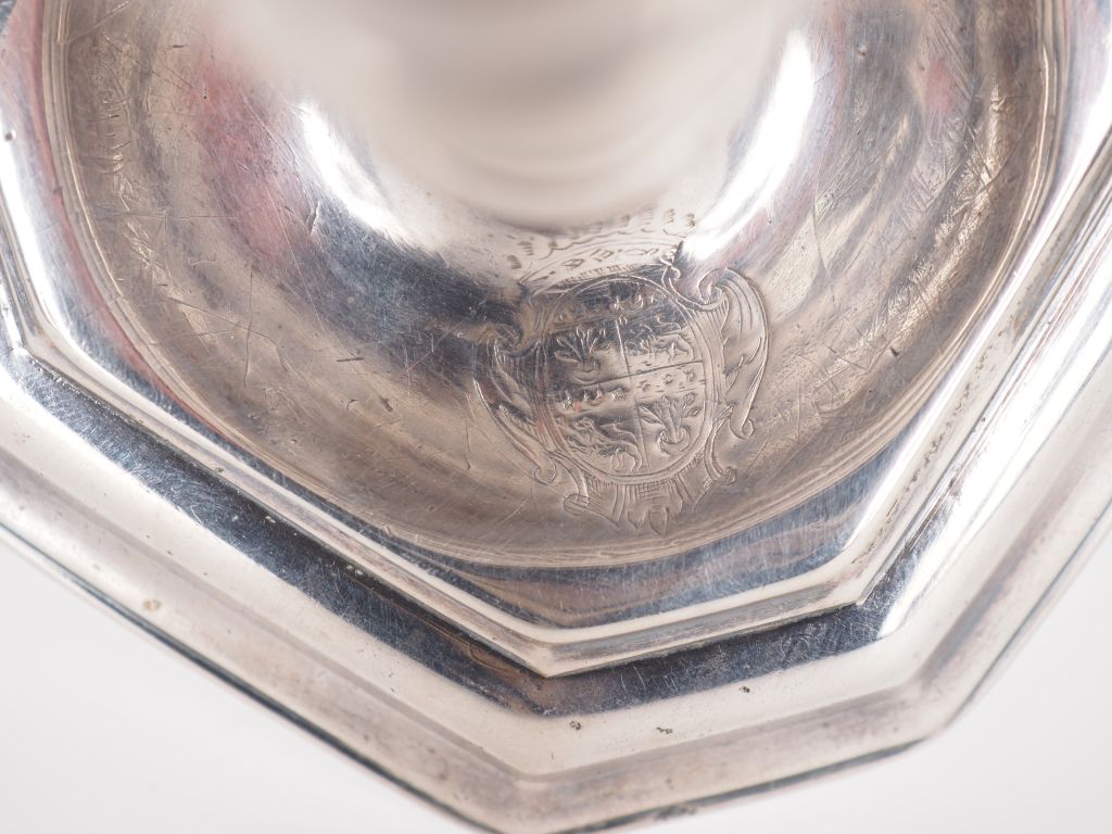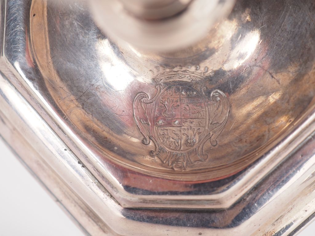 Paire de flambeaux XVIIIème en argent Montpellier 1691-1692 MO : Jean Bellez Aux armes des Rambaud Léonard Poids : 658 g H. 14 cm (petit trou visible sur un des flambeaux au niveau du binet) Provenance : ancienne collection de Monsieur Le chanoine J. GIRY référence : Jean Thuile "l'orfèvrerie du Languedoc Généralités de Montpellier et de Toulouse, planche XIII"