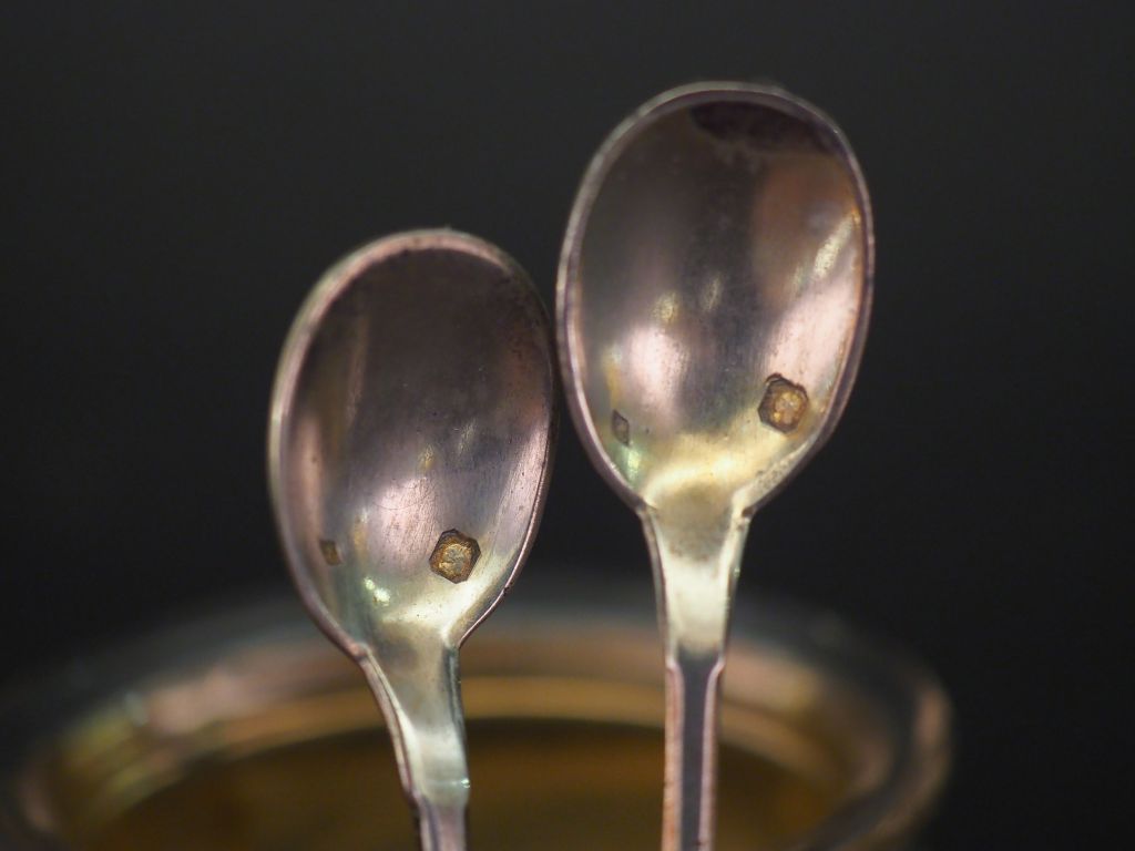 Paire de salerons de style Art déco en argent, poinçon Minerve, et leur pelle à sel. Avec leur verrine. Poids. sans les verrines : 54 g