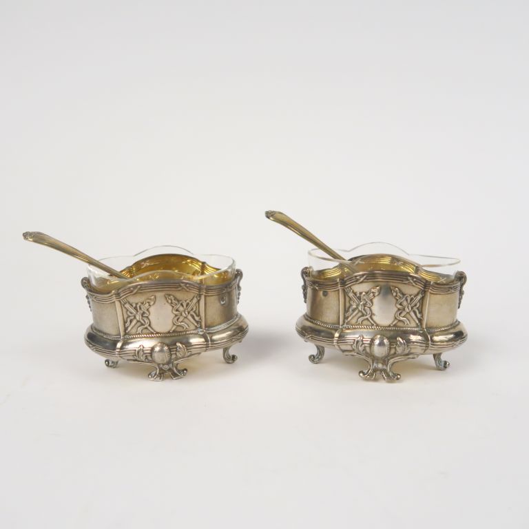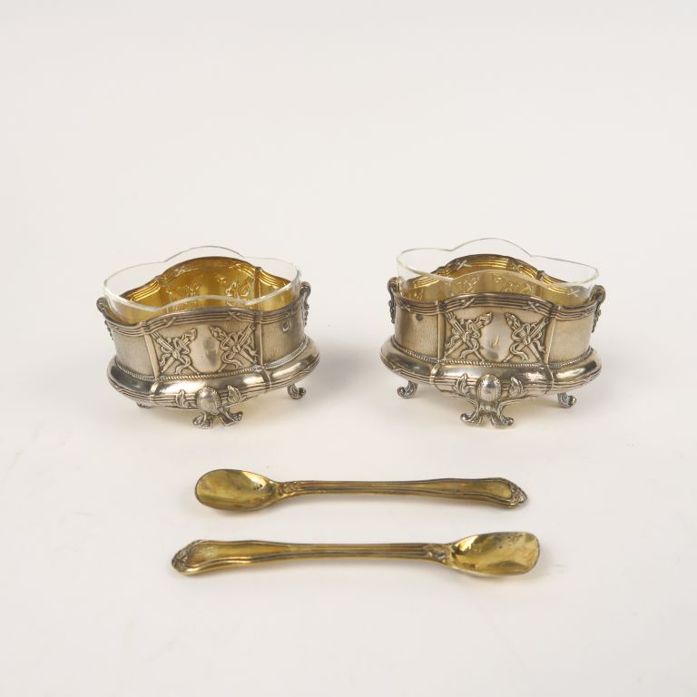 Paire de salerons de style Louis XVI en argent, poinçon Minerve, à décor de torches et de carquois. On y joint deux pelles à sel en vermeil, poinçon Minerve. Poids. 56 g
