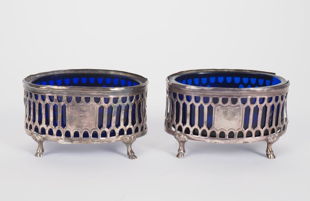 Paire de salerons XVIIIème en argent, à décor ajouré et de cartouches. Avec leur verrine. Reposant sur quatre pieds biche. 4,7 x 7,7 x 5,3 cm Poids. sans les verrines : 64 g (accidents)