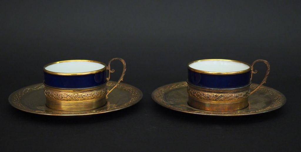 Paire de tasses et leur sous-tasses de style Louis XVI en vermeil, poinçon Minerve, et porcelaine bleu de four rehaussé d'or. Monture des tasses et sous-tasses, à décor de guirlandes de feuilles de laurier. Poids. 265