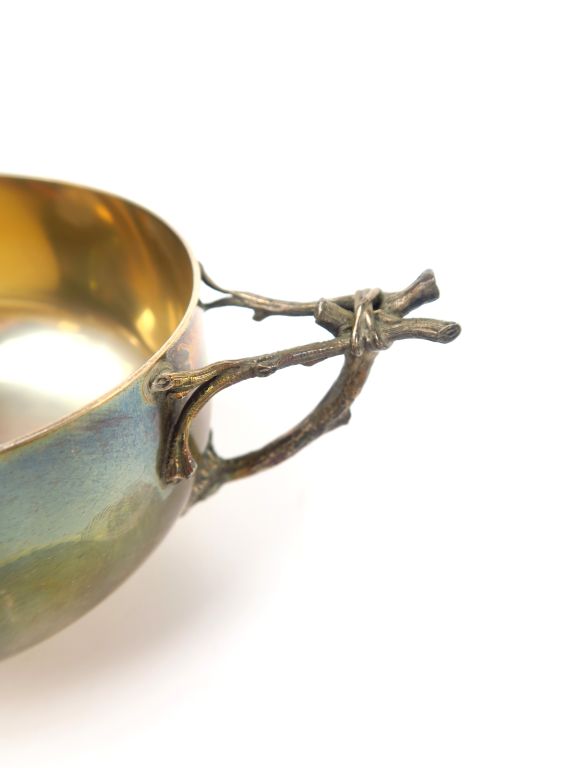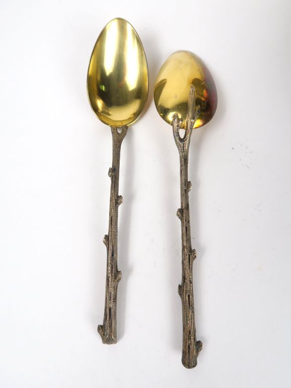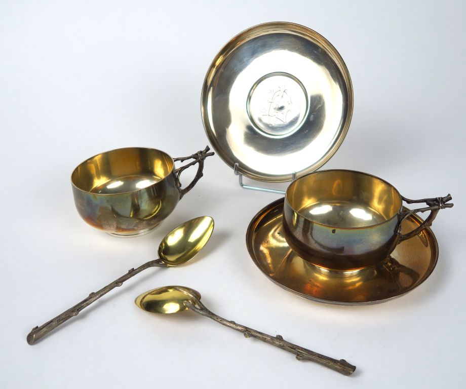 Paire de tasses et sous tasses à thé en argent, poinçon Minerve. Prises en forme de branches nouées. Sous tasses monogrammées. Avec leurs cuillères en forme de branches. Maitre orfevre AD. Poids : 685 g