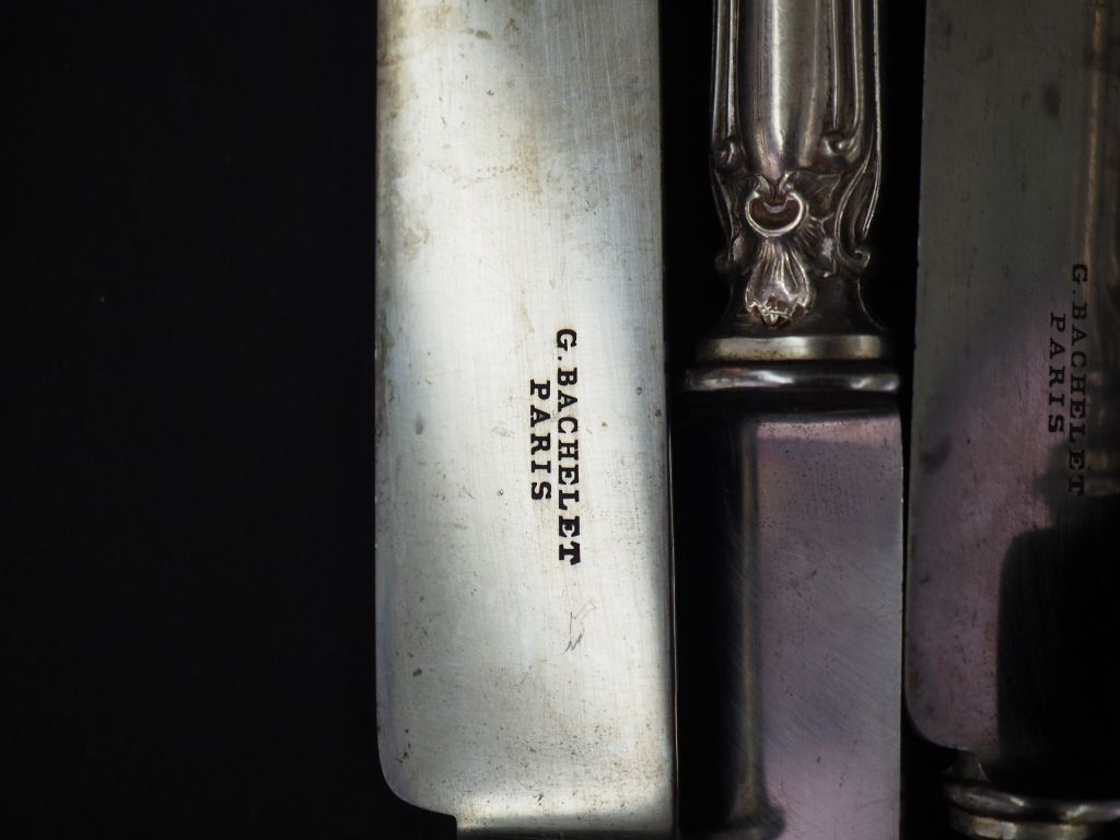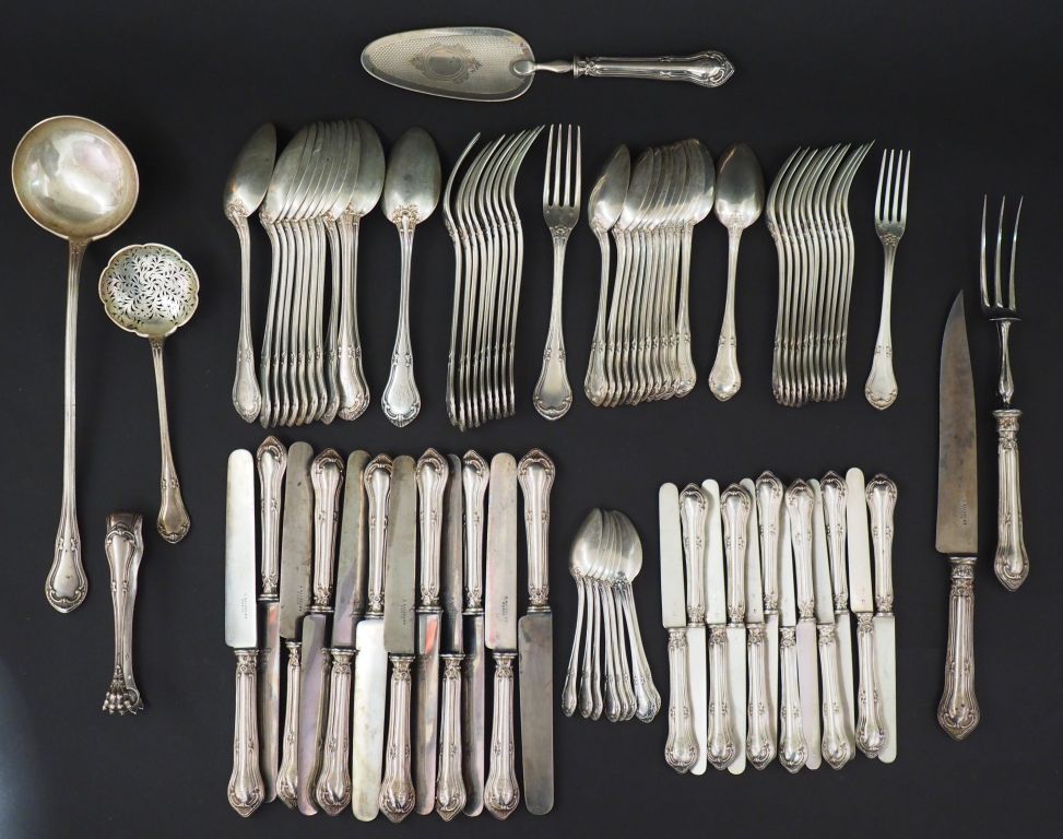 Partie de ménagère de style Louis XV en argent, poinçon Minerve. Monogrammée. Comprenant : - dix grands couverts et deux grandes cuillères - douze couverts à entremets - huit petites cuillères - douze grands couteaux - douze couteaux à fruits, lame argent. - nécessaire à découper, louche, cuillère à saupoudrer, pelle à tarte, pince à sucre. M. O : PQ Poids des pièces pesables : 3822 g