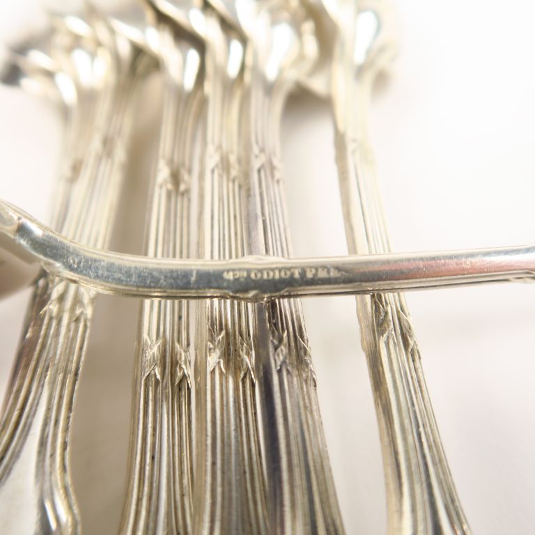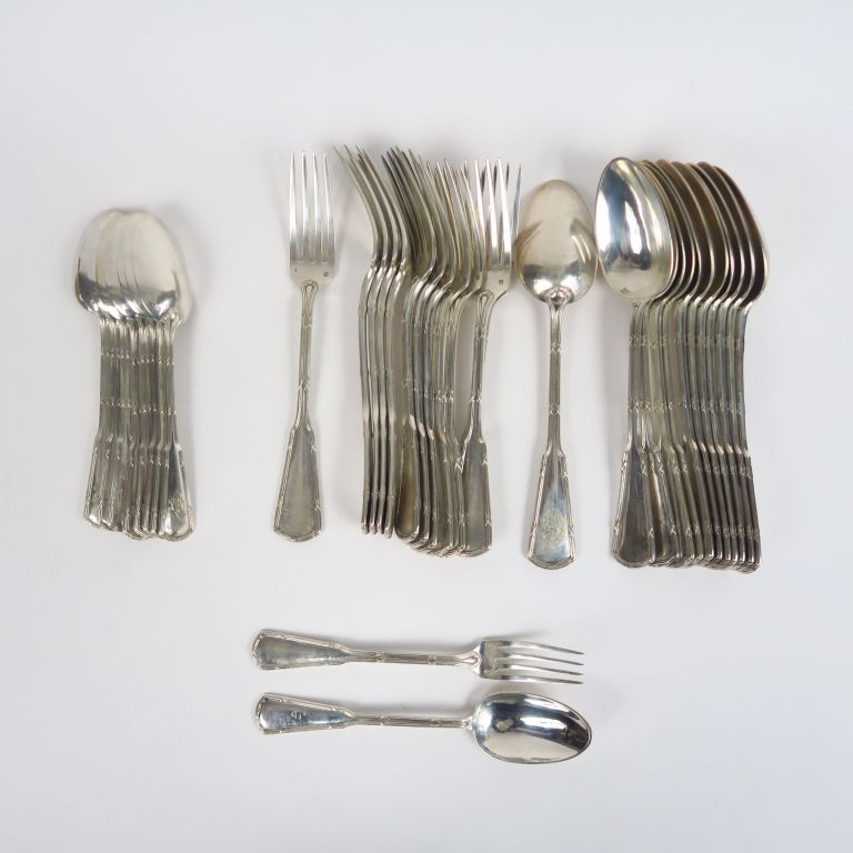 Partie de ménagère en argent, poinçon Minerve, à décor de tiges enrubannées et de monogramme. Comprenant : - douze grands couverts - un couvert à entremet - huit cuillères à entremet M.O : Odiot. Poids.2723 g