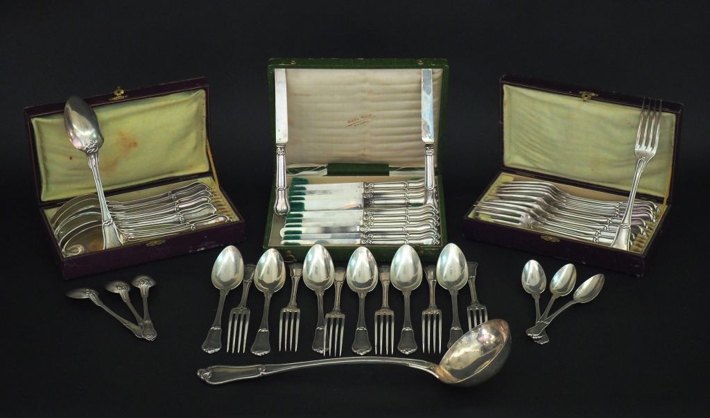 Partie de ménagère en argent, poinçon Minerve, à décor d'entrelacs et d'armoiries. Comprenant : - neuf grands couverts - six couverts à entremets - douze couteaux à fruit, lame argent - six petites cuillères - une louche Poids. sans les couteaux : 2740 g Poids tel. Des couteaux : 515 g