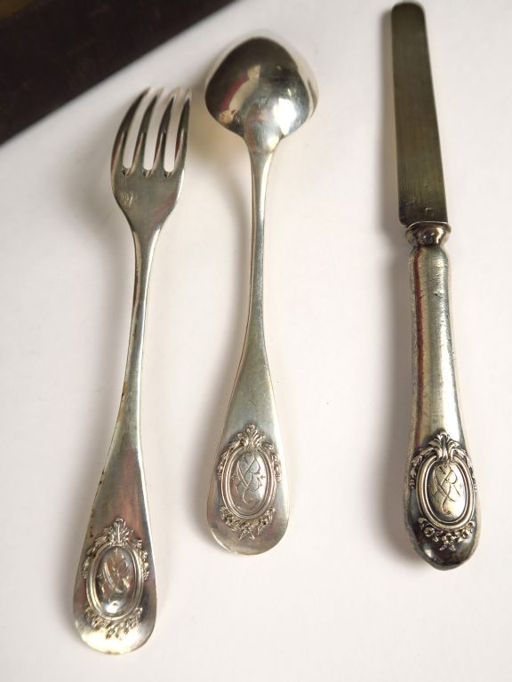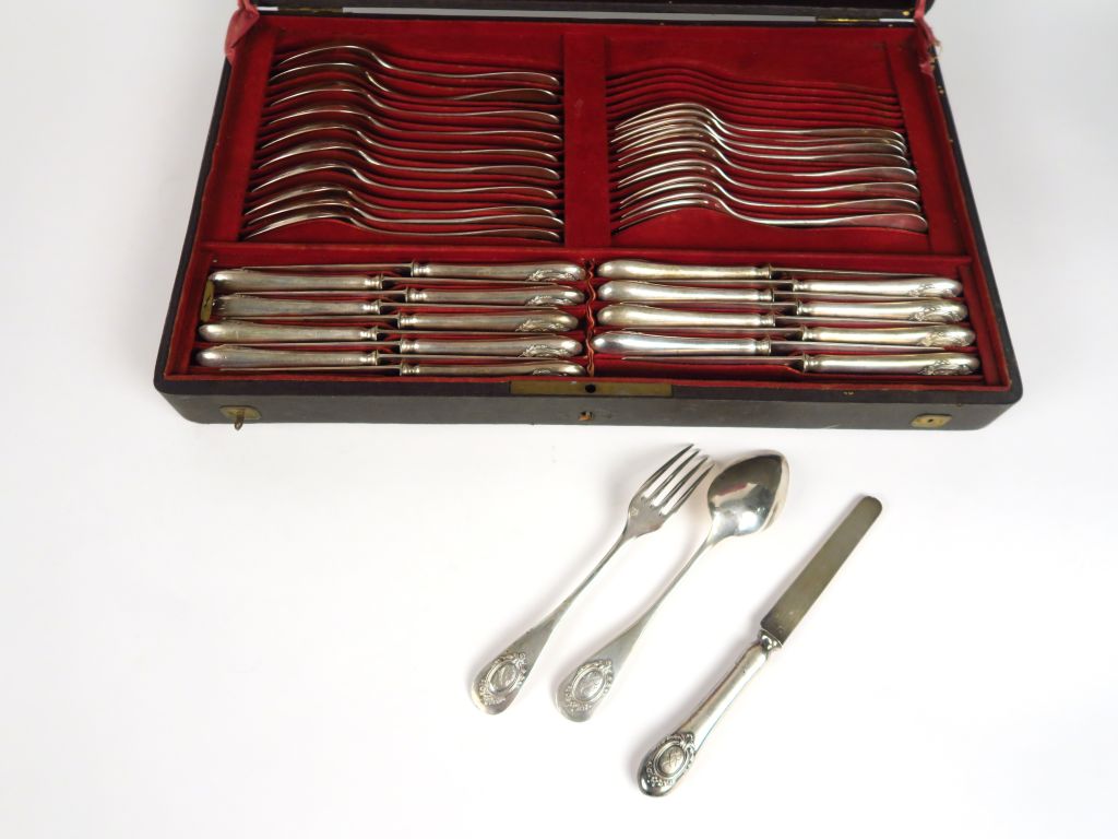 Partie de ménagère en argent, poinçon Minerve, à décor d'un médaillon chiffré, comprenant 9 couverts à entremets et deux cuillères, 18 couteaux lame argent. Dans leur écrin. Poids des couverts : 934 g. Poids des couteaux : 708 g tel