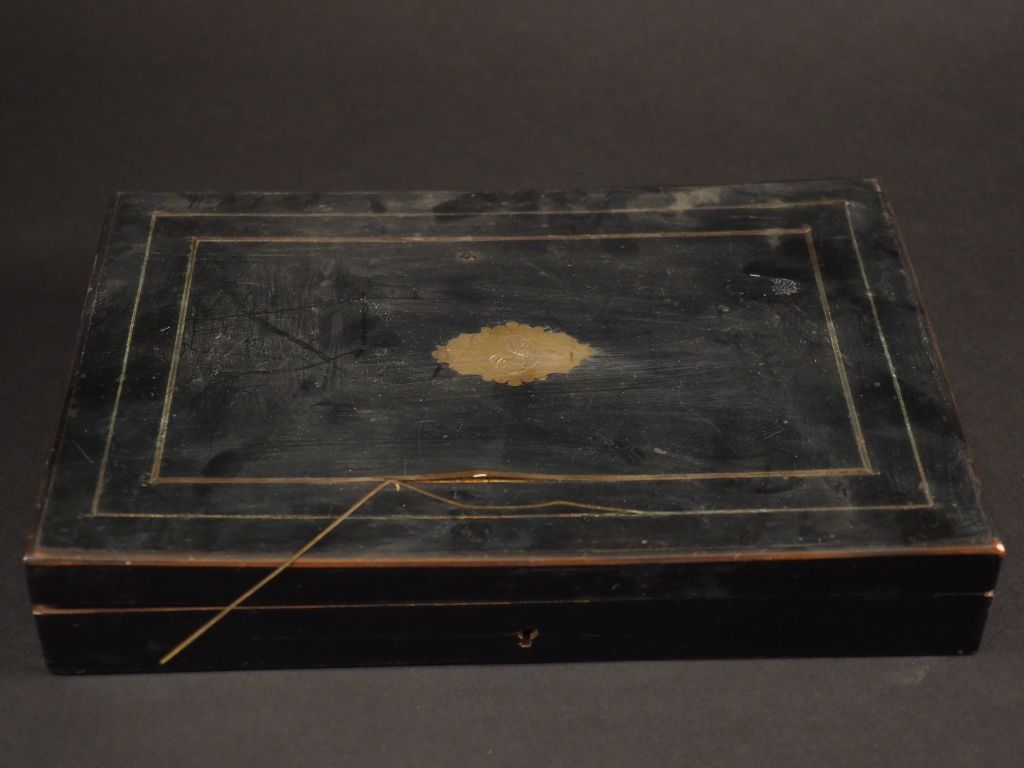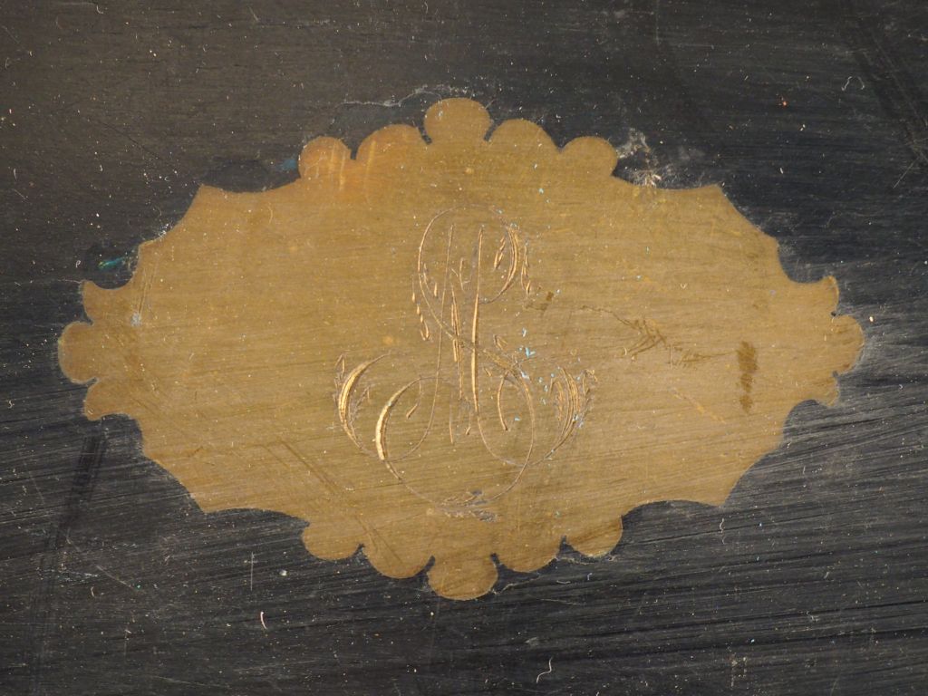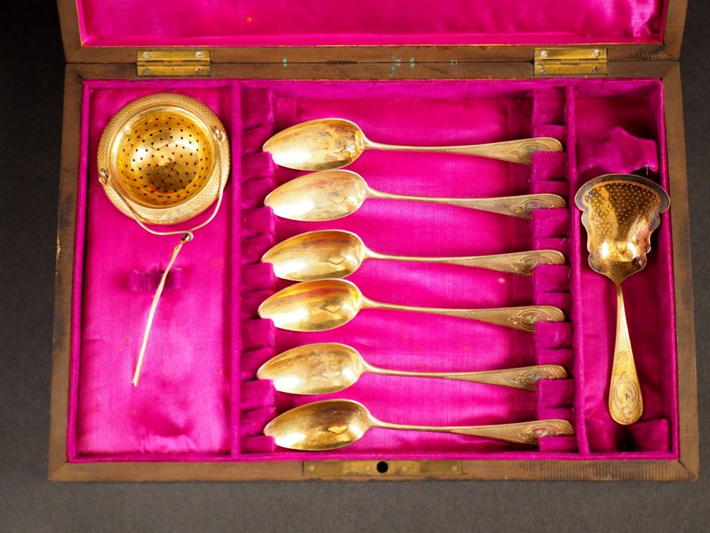 Partie de service à thé de style Louis XVI en vermeil, modèle à cartouche monogrammé. Comprenant : - six cuillères - une passette à thé - une cuillère Poids. 126 g Dans un coffret en bois noirci et laiton, monogrammé. (manques)