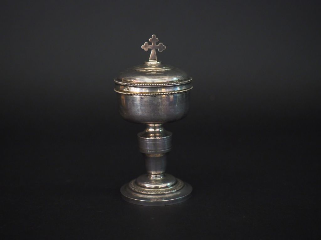 Petit ciboire de voyage en argent, poinçon Minerve, surmonté d'une croix. Le fut se dévissant et laissant découvrir une petite croix et un petit réservoir à Saint Chrême. La base à décor d'une frise de feuillage. H. 11,5 cm Poids. 77 g