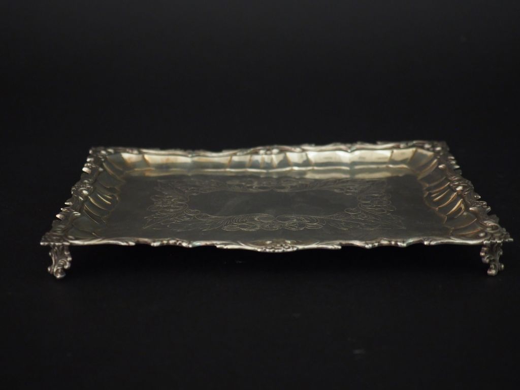 Petit plateau Napoléon III en argent, à décor de rinceaux et de fleurs. Reposant sur quatre petits pieds feuillagés. H. 1,8 cm 16 x 21,2 cm Poids. 225 g